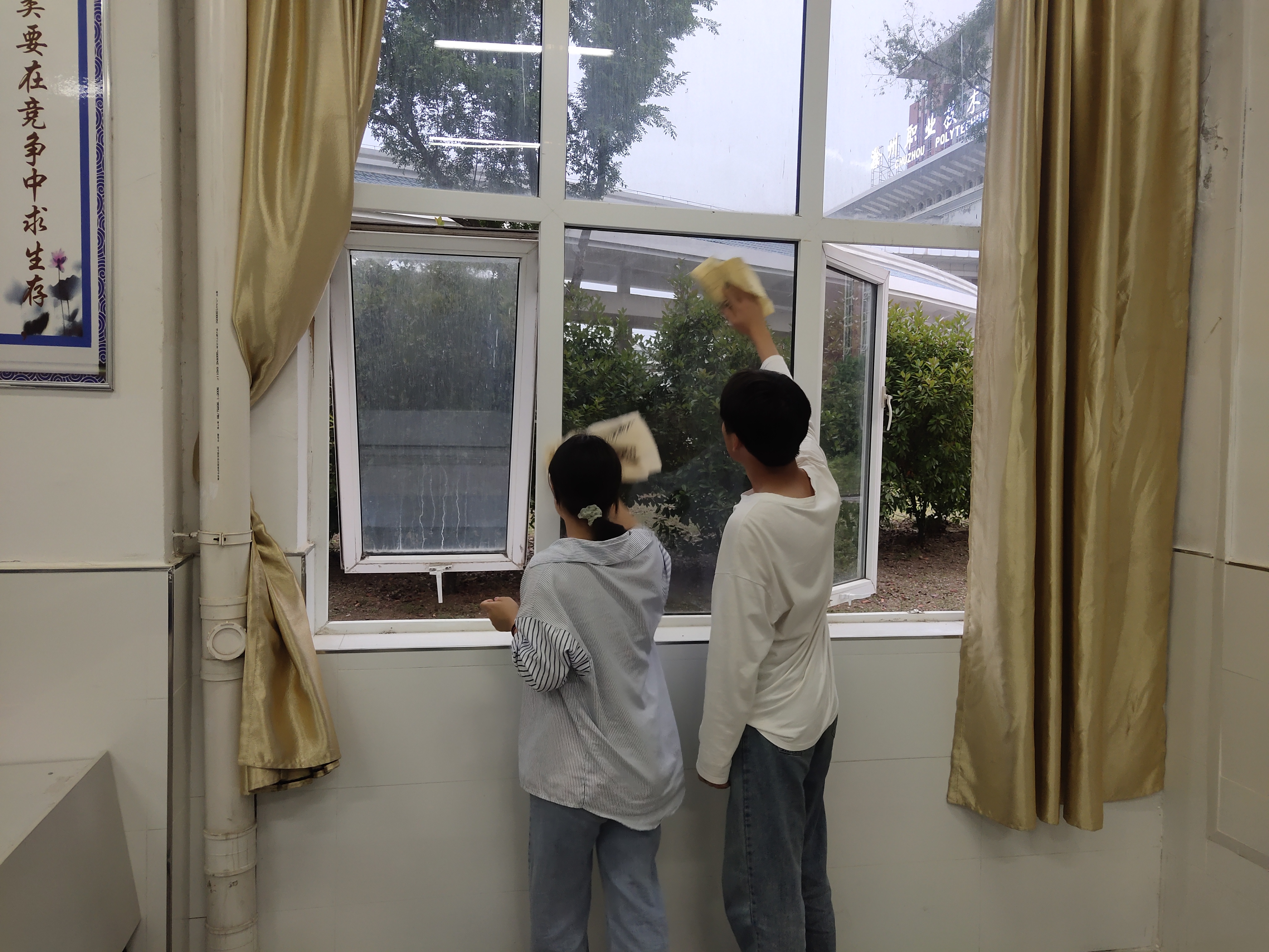 同学们分工明确,有的打扫教室,有的打水,有的擦窗,大家充分发扬不怕苦、不怕脏的精神,不放过任何一个卫生死角。