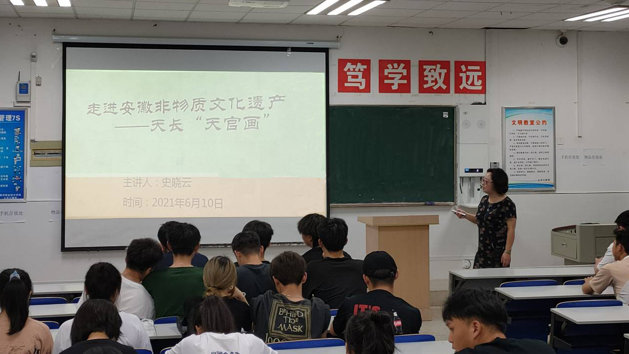 “走进安徽省非物质文化遗产”系列讲座——天长“天官画”于2021年6月10日晚在传媒与设计学院4110教室举行,本次讲座由史晓云副教授主讲,广告设计、室内设计班全体学生聆听了讲座。