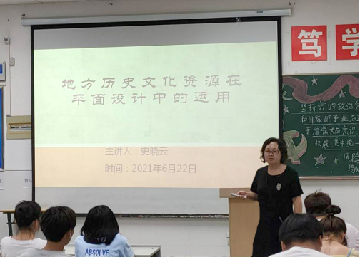 为了提升艺术专业学生的设计能力,一场题为“地方历史文化资源在平面设计中的运用”的讲座于2021年6月22日在传媒与设计学院4110教室举办,本次讲座由史晓云副教授主讲,室内设计、广告设计班全体学生聆听了讲座。