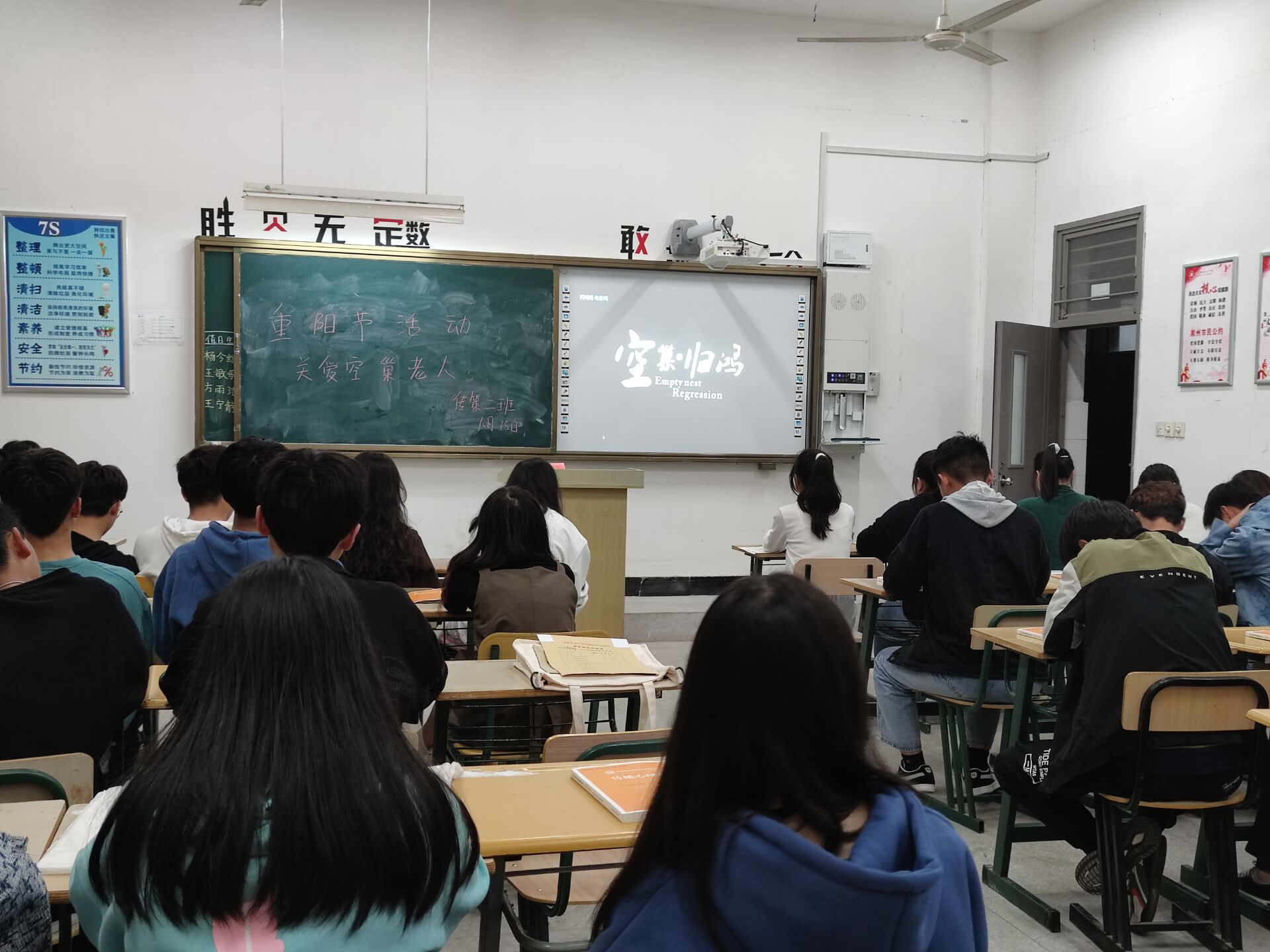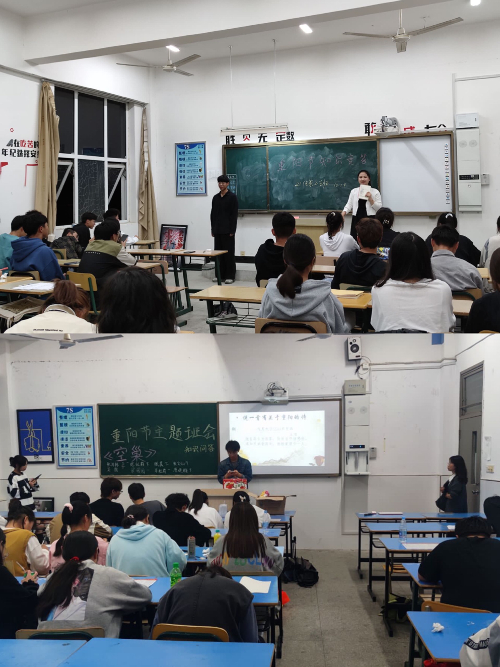 随着我国人口老龄化程度的不断加深,空巢老人也越来越多,各班级借助教室多媒体设备,播放电影《空巢·归鸿》、组织观后感讨论,大家踊跃发言,表示应注重对老人的精神关怀。而后,各班级开展重阳节相关知识问答竞赛,同学们积极参与,在活跃的氛围中收获传统文化知识。