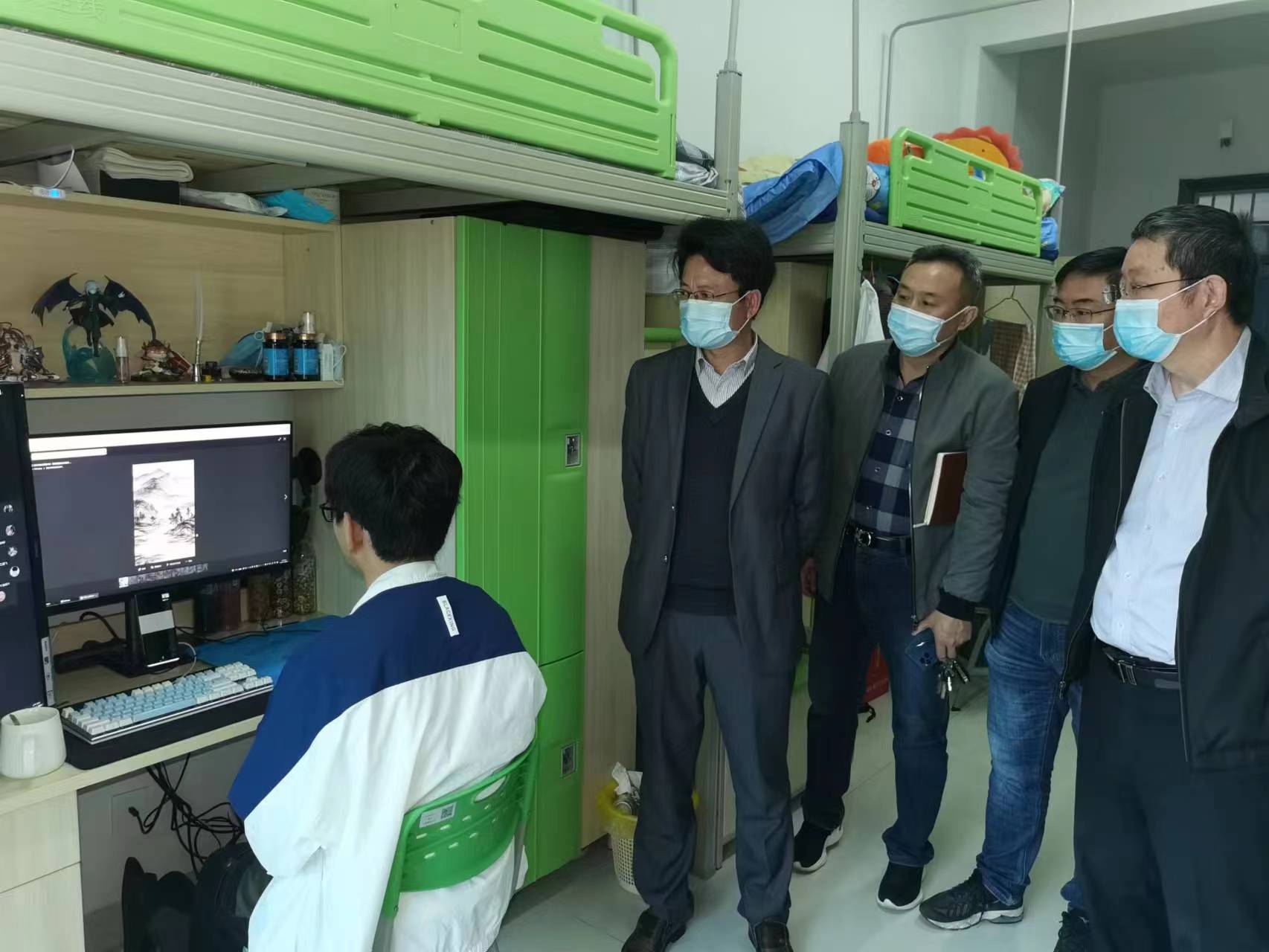 5月3日,校党委委员、副校长苏有良深入学生宿舍看望慰问学生,调研指导线上教学情况和疫情防控工作。上午8点,苏有良一行来到传媒与设计学院14号学生宿舍楼,20动漫专业、21室内设计专业学生宿舍进行走访详细了解线上教学开展情况。宿舍内,学生使用手机、电脑等终端设备已经登录曹明老师《中国画技法》线上直播教学平台,老师正在教授课程。苏校长与同学们亲切交谈,认真听取同学们对学校线上课程教学质量、封控期间学习生活情况的意见建议。鼓励同学们要适应新的教学方式,有问题要及时请教老师,端正学习态度,努力提高专业技能。