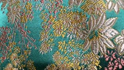 古法服装中以贯口式、披巾式、上下分体式制为主的款型一直延续至今,并且反复被运用;中国传统美学原理经常被用作构图、布局的两种格律——米字格与九宫格也被灵活的运用在服饰中:按人体的主要结构点组织格律,在人体的外轮廓形上,用竖中轴线和横中轴线交叉构成田字格形等等。给同学们详细介绍了古法服装索采纳的面料(宋锦、云锦、蜀锦),还展示了云锦的实物,正面是一色,侧面是一色,同学们很是惊叹老祖宗的智慧。