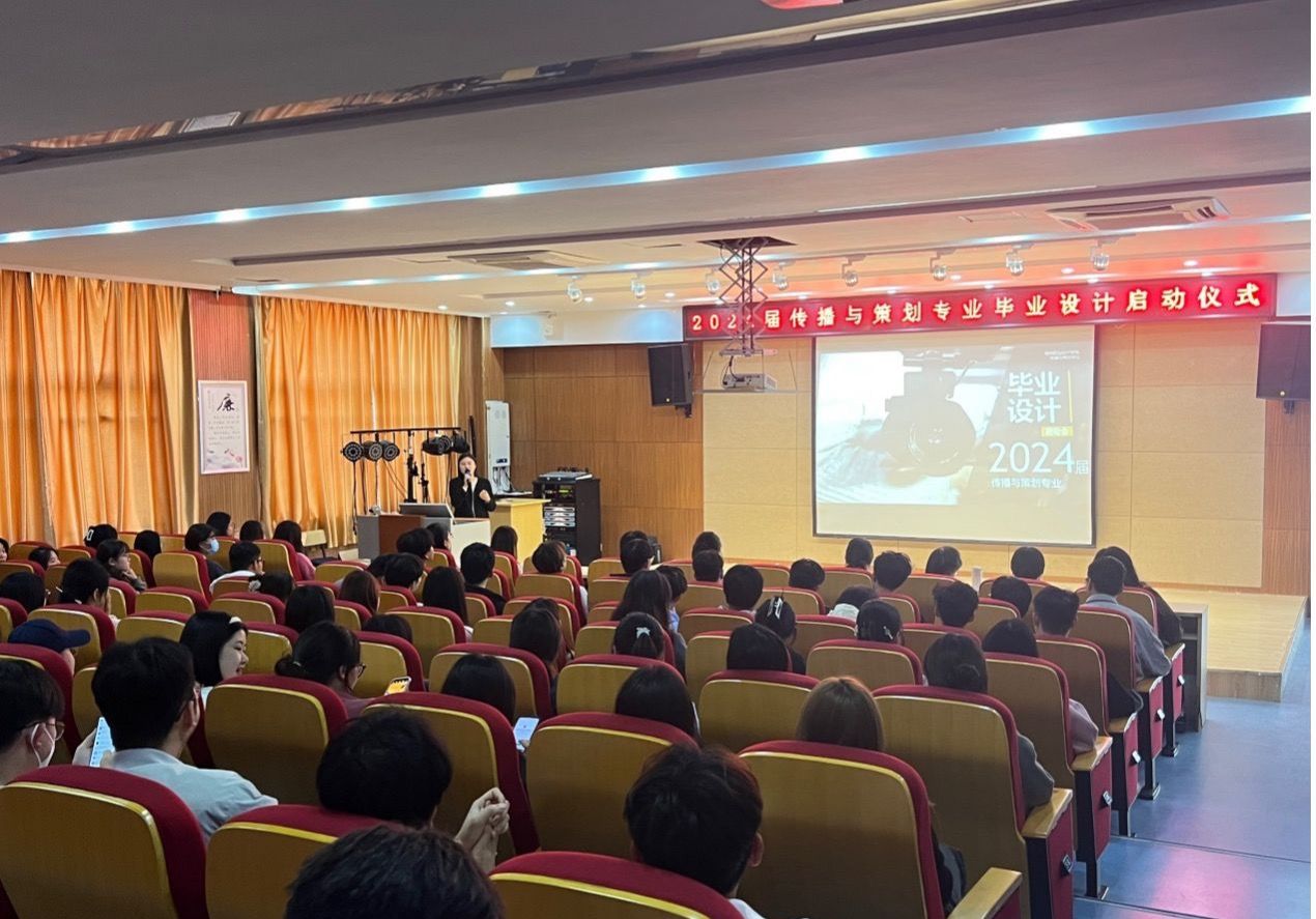 10月23日下午, 传媒与设计学院数字媒体系2024届传播与策划专业毕业设计启动仪式在南阶203举行。数字媒体系党支部书记、系主任李雯雯主持活动,闫正洲、陈潇潇、林茜、匡卓凡等毕业设计指导教师及2024届传播与策划专业全体学生参与活动。