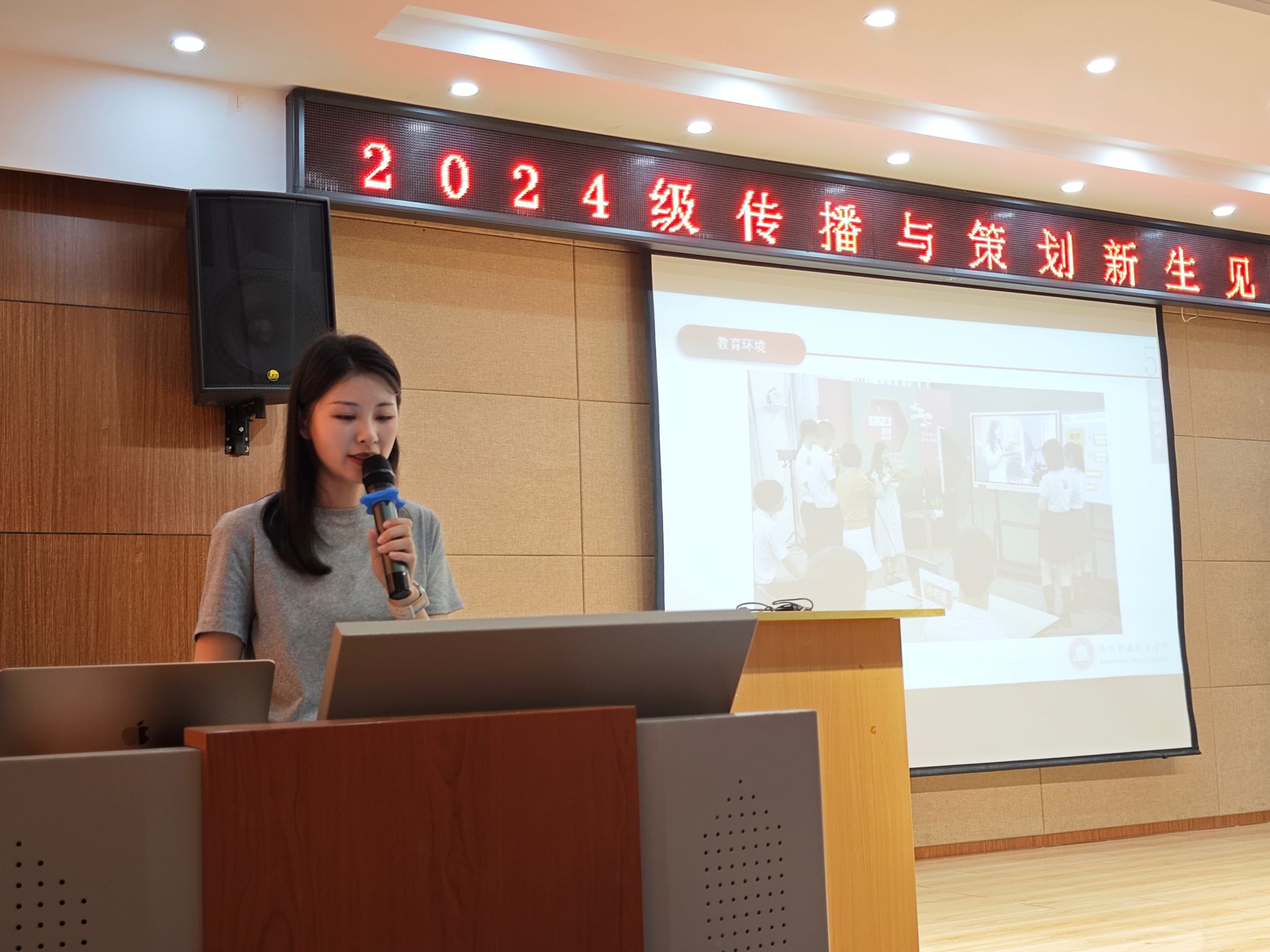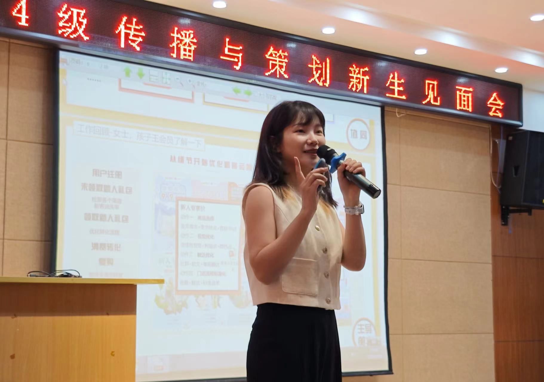 李雯雯从专业、获奖情况和师资队伍进行详细的介绍,告诉大家传播与策划是一个新兴充满活力的行业,注重专业创意、创新思维和自我能力的培养,她强调了传媒人应有对行业的热爱和专业技能,希望新生可以努力锤炼本领,用理论指导实践。