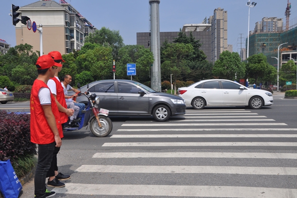 2016年6月26日,传媒系学生会在学校门口开展了暑期社会实践活动之交通秩序维护。
