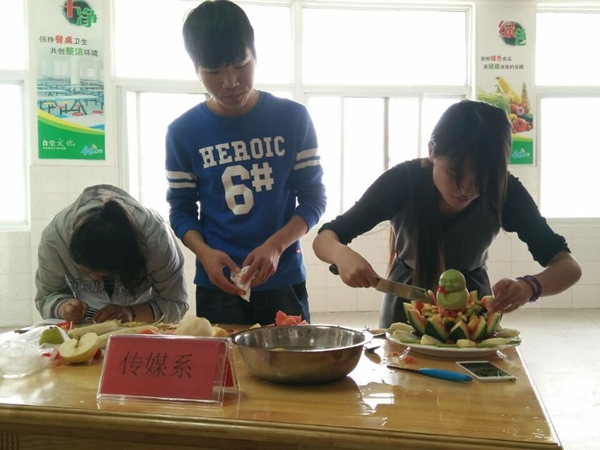 为体现当代大学生的青春活力和动手能力,2016年4月12日中午12:10分,院学生会在新食堂三楼举办了一次别有韵味的水果拼盘大赛。传媒工程系学生参加了本次比赛。