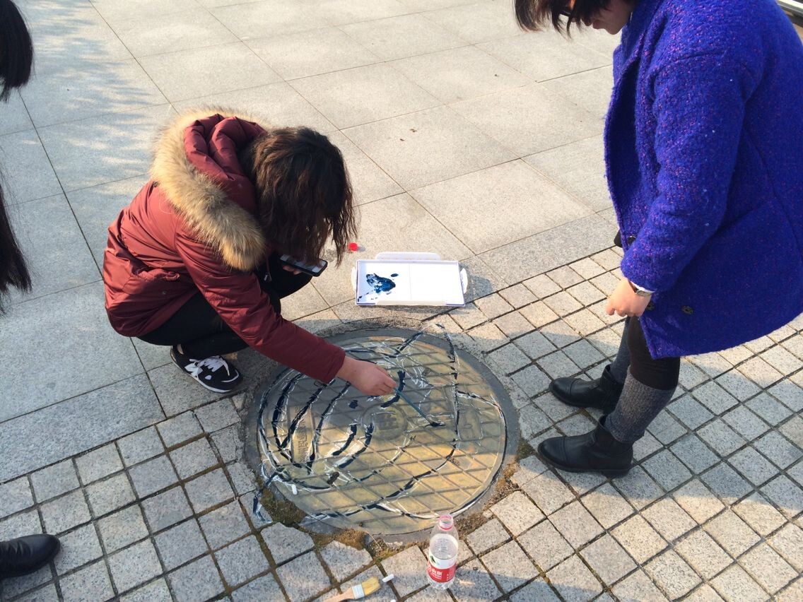 参赛的同学们准备好了颜料、画笔、调色板等绘画所需用品,随后依据抽签分组后奔赴各自的井盖分布区;绘画时,他们一丝不苟,不惧天气等不利因素带来的严峻考验,在冬日里用自己的热情装点冷冰冰的灰色井盖,用彩色的画笔为他们穿上漂亮的新装。近两个小时后,校园普通的井盖就摇身变成了飞翔的易拉罐、360卫士图标、海贼王路飞、深井的蝴蝶等图案。我系党总支书记王广保也来到现场看同学们绘制,对同学们进行了鼓励和赞扬,他指出,能够在井盖上绘画出如此立体的画作的同时也是表现出我们传媒系学生的专业特色和技能。