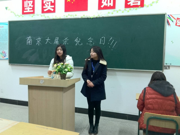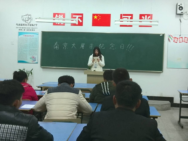 活动现场:我系生活部和学习部干事都积极认真地对待本次的宣传工作,学习部干事宣读了关于“南京大屠杀死难者国家公祭日”的相关资料,生活部干事维持了各班级的纪律,使得各班级秩序保持良好,学习部干事才能够认真的进行宣传,当然这也离不开每一个同学的积极配合,在此向他们表示感谢。