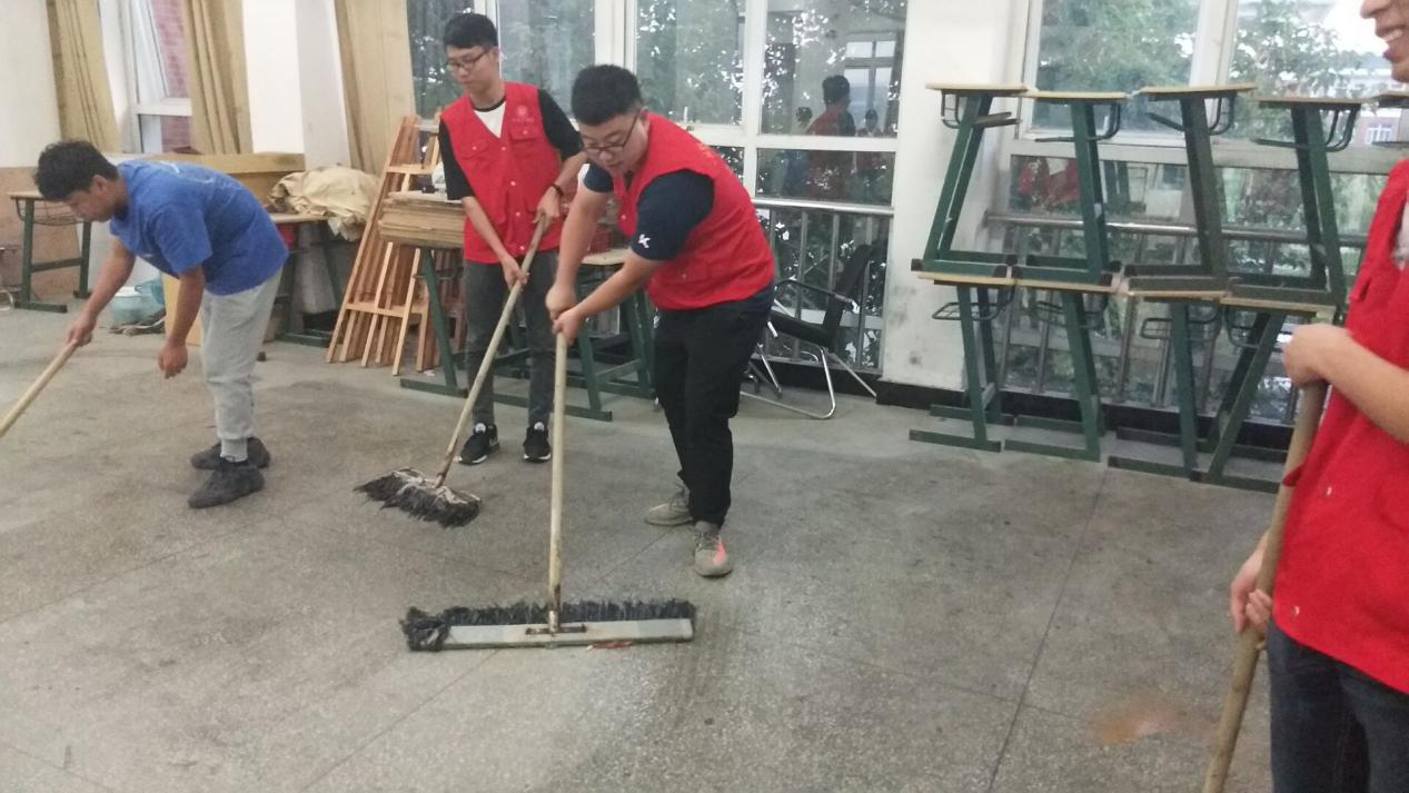 志愿者们认真打扫每一个角落。地面、桌子、玻璃等角落都一一清扫,经过半个小时的共同努力志,教室焕然一新。