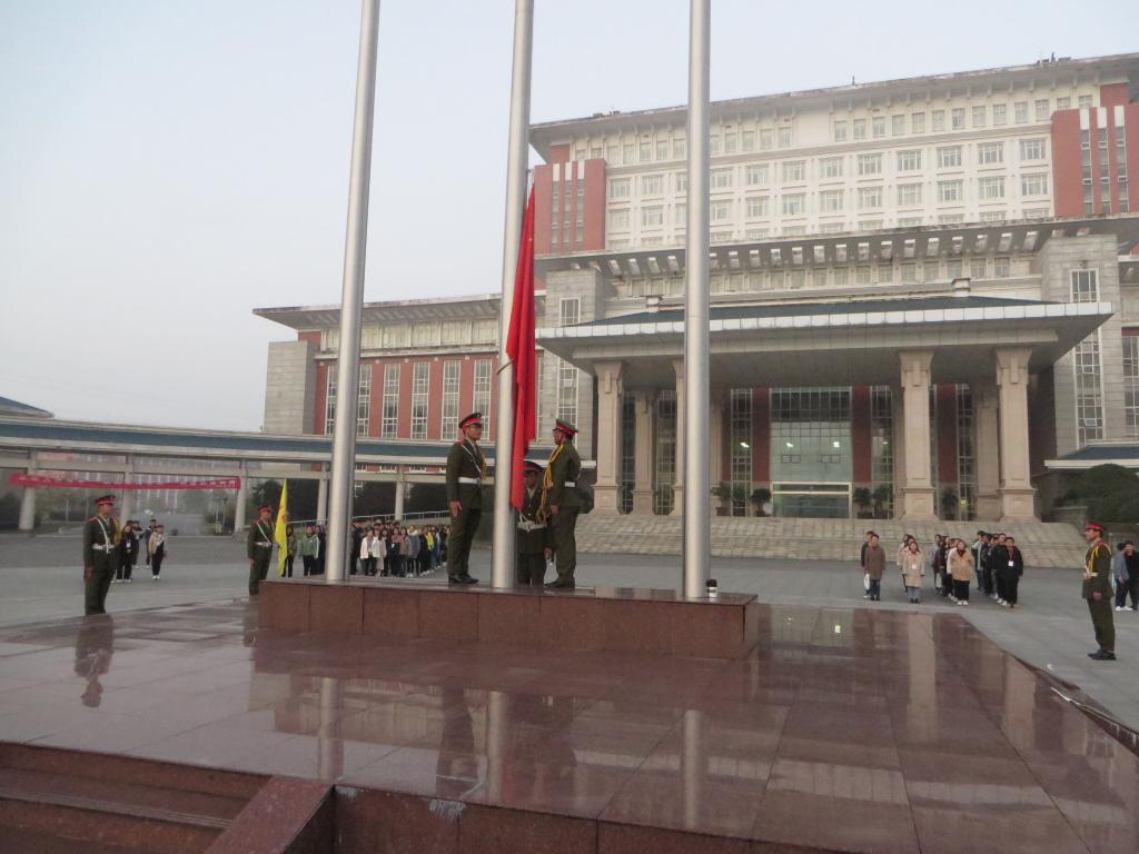 天色微亮,同学们便早早起来,在升旗台前列队等候。6点30分升旗仪式正式开始,国旗护卫队队员保持方块队形,步伐一致,齐头并进。五星红旗冉冉向着朝阳升起,在场所有同学庄严肃立,目光都聚集在五星红旗之上。