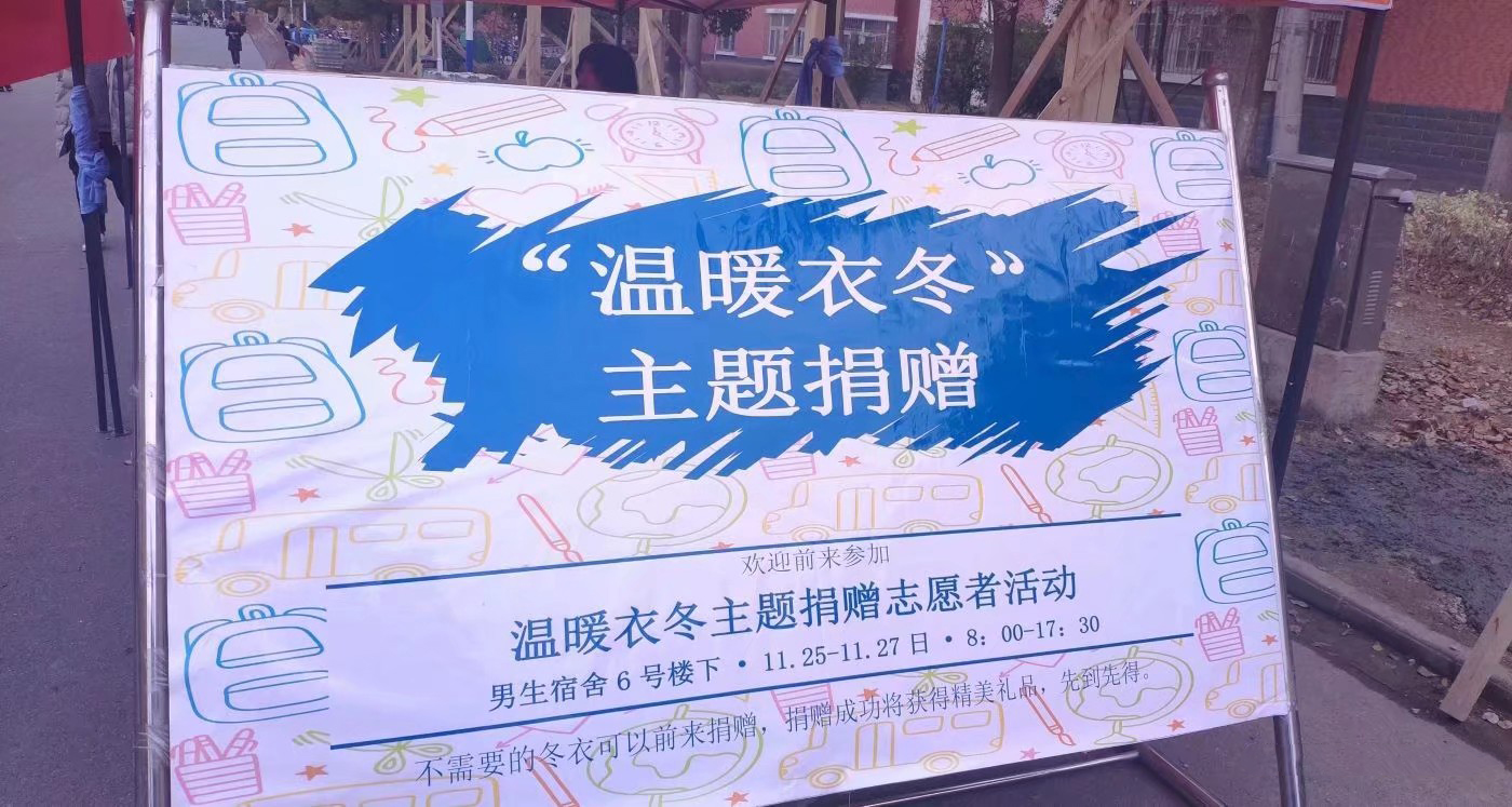 为了响应滁州市天使协会关于开展的“送温暖献爱心”捐赠活动的号召,组织以“温暖衣冬”为主题的捐赠活动,实现闲置资源的合理化配置与循环使用,给贫困地区儿童寒冬里送去一份温暖,传媒学院团总支联合食环学院于11月26日至11月27日举办“温暖衣冬”捐赠冬衣活动。
