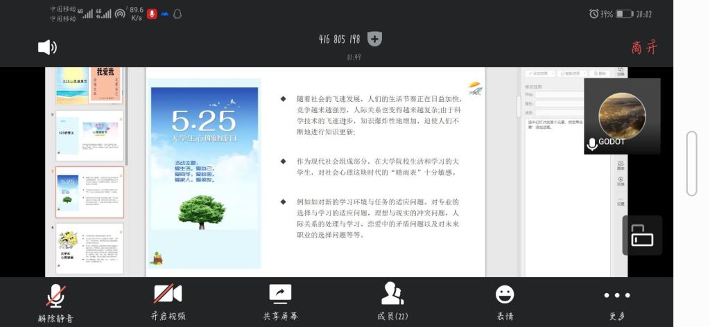 为进一步提高我院大学生的心理素质,促进学生们的身心健康和谐,宣传普及心理健康知识,深入开展心理健康教育。5月27日,传媒与设计学院学生会在腾讯会议召开以“宅家新生活”为主题的心理健康线上会议,会议内容主要涉及“爱生活,爱自己,爱同学,爱校园,爱家人,爱朋友”等方面。会议由学生会副主席钱思思主持,学生会大一、大二干事参与线上会议。