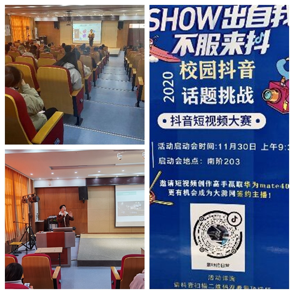 主讲人从新媒体时代特征入手,通过5G技术对新媒体的推动,结合案例详细解读了短视频未来的发展趋向,令同学们了解到,短视频在时长上的可控性,商业广告、新闻资讯类短视频也将迎来更多的机会,通过提供具有理性、知识水平、有趣的热点信息,满足当下人们对真实客观、动态立体视频信息的需求,同时也将给媒体融合发展传播带来了全新模式。当前网络结构以中青年群体为主,20-29岁网民占26.8%,10-39岁网民占67.8%,他们的兴趣爱好和审美趣味成为了短视频创作的风向标。这个网络群体成员大多都活跃于微博、微信、快手、抖音等分享性的社交网络平台中,通过上传、分享短平快、创意有趣的短视频,来完成对新鲜事物、最新的新闻资讯的渴求,同时也获得其他用户的关注认可,这更符合年轻人的社交分享习惯。本次校园抖音短视频大赛,倡导学生大力发现和表现从生活周边到社会现象,从个人到群体,从衣食住行、餐饮娱乐、旅游观光、扶贫脱贫等角度,用构图和配乐来生动体现大赛主题。参赛短视频,需具备故事性、艺术性和思想性,能体现积极向上正能量,体现中国传统文化之精华。