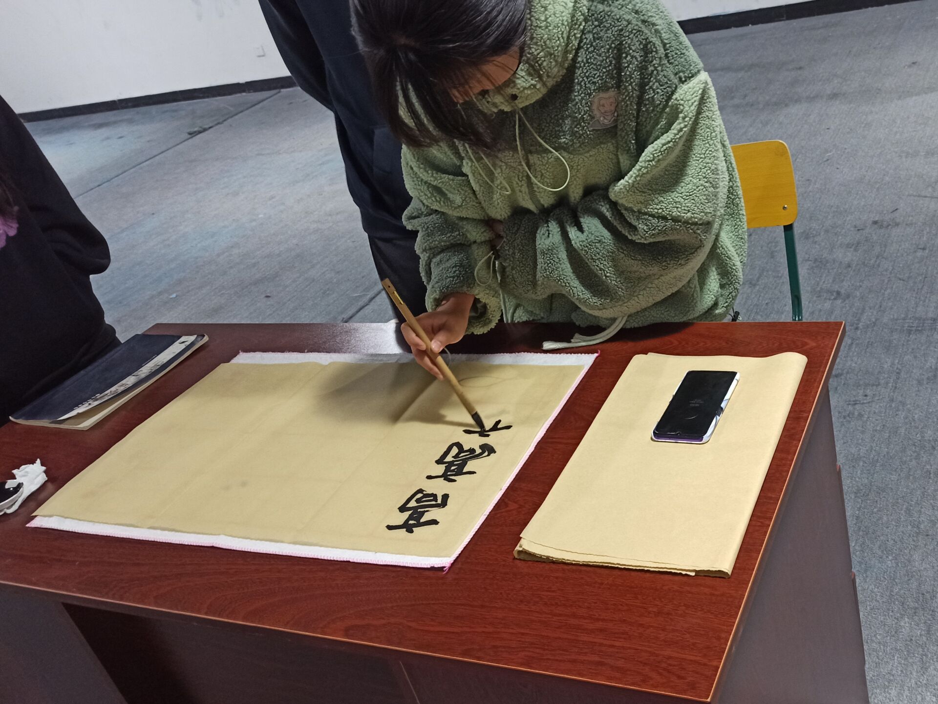 活动现场弥漫着墨香,有来自书法社社长的展示,展示的笔法潇洒,书法作品气势恢宏。看到大家对书法如此热爱,书法社社长开始了现场展示教学,一个个法度谨严,规中见逸的大楷从他的笔下诞生。
