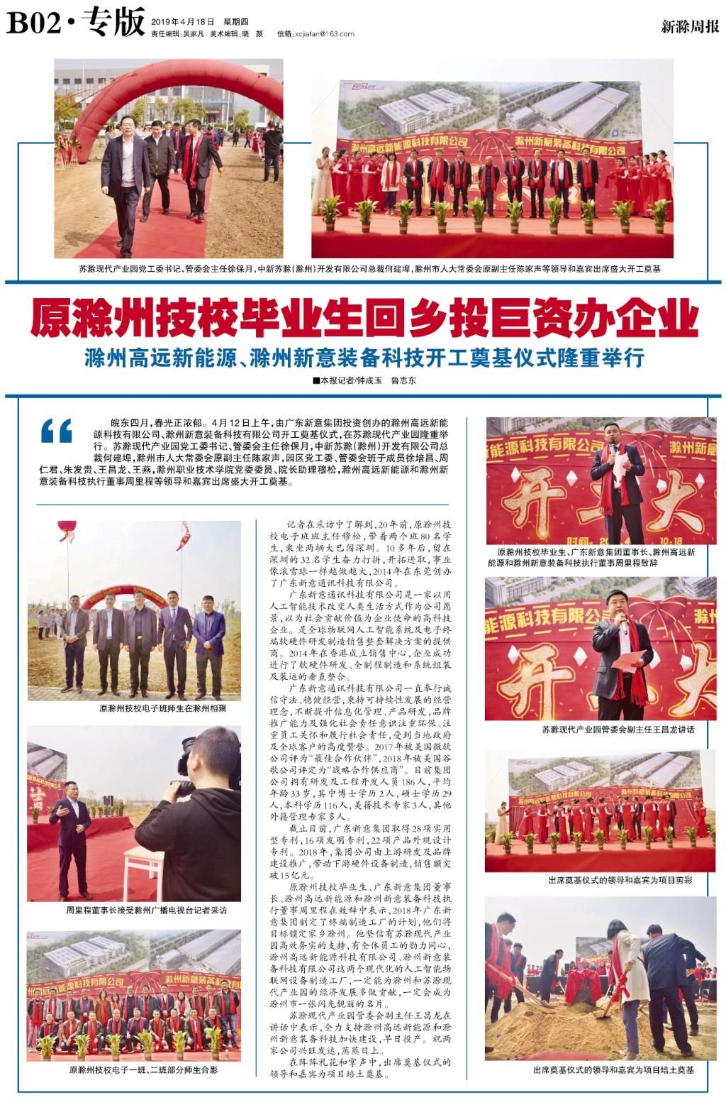截至目前,广东新意集团取得28项实用型专利,16项发明专利,22项产品外观设计专利。2018年,集团公司由上游研发及品牌建设推广, 带动下游硬件设备制造,销售额突破15亿元。原滁州技校毕业生、广东新意集团董事长、滁州高远新能源和滁州新意装备科技执行董事周里程在致辞中表示,2018年广东新意集团制定了终端制造工厂的计划,他们将目标锁定家乡滁州。他坚信有苏滁现代产业园高效务实的支持,有全体员工的勸力同心,滁州高远新能源科技有限公司、滁州新意装备科技有限公司这两个现代化的人工智能物联网设备制造工厂,一定能为滁州和苏滁现代产业园的经济发展多做贡献,一定会成为滁州市一张闪光靓丽的名片。