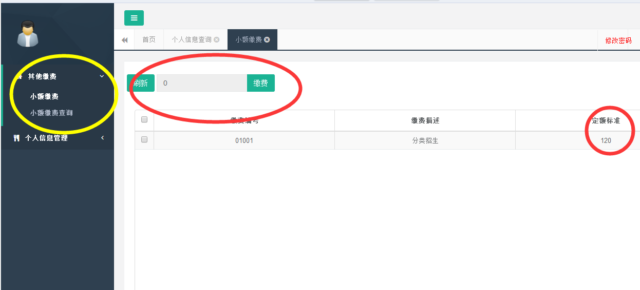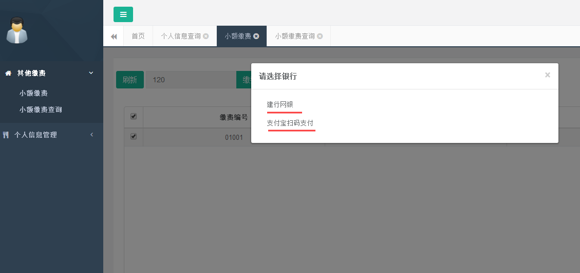 进入系统后点击左上角“其他缴费”菜单下“小额缴费”,如下图:(本系统支持建行网银、微信扫码支付),