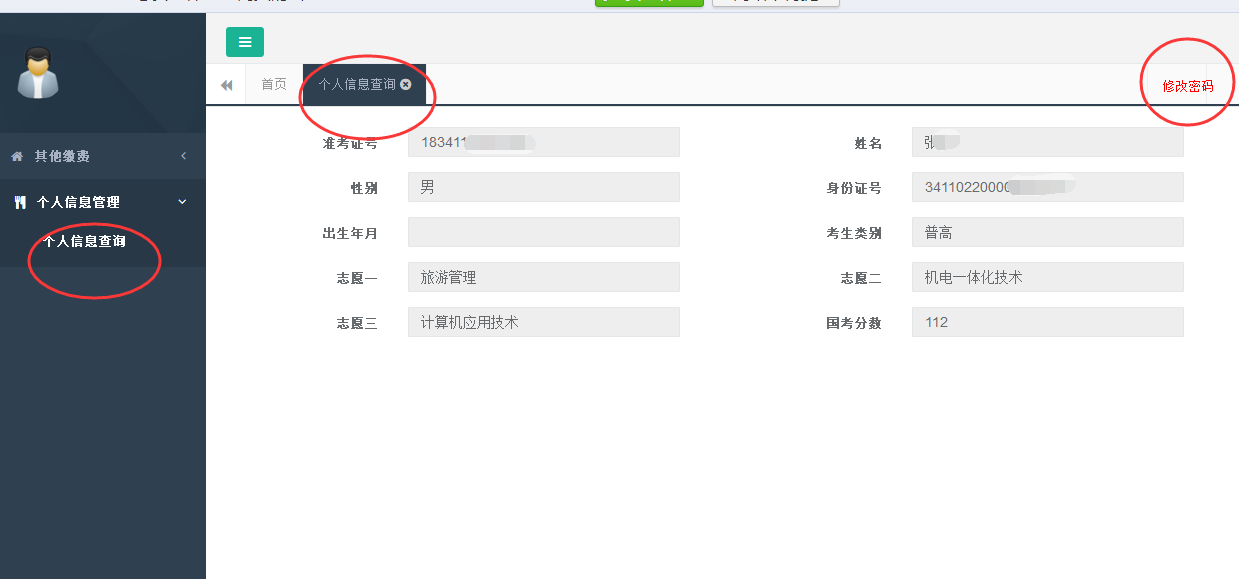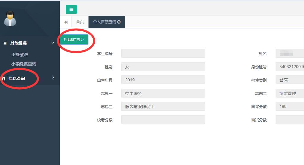 登录系统后,可以点击“个人信息查询”查看您的分数、志愿等信息,如下图: