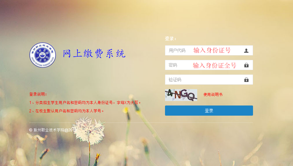 一、登录(http://cwc.chzc.edu.cn/wsjf/login):(本系统只支持IE10以上浏览器及火狐浏览器,建议使用火狐或360极速模式)