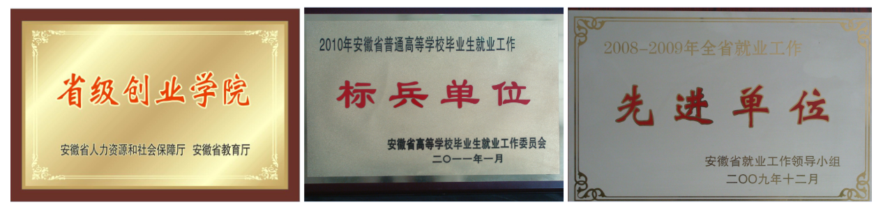 2016年以来,学校创业学院被认定为省级创业学院、孵化基地被认定为省级和市级众创空间、退役军人就业创业培训基地。学校毕业生就业率始终保持在95%以上,曾连续八年被安徽省教育厅评为全省就业工作“先进集体”和“标兵单位”;连续二次被省政府表彰为全省就业工作“先进集体”。