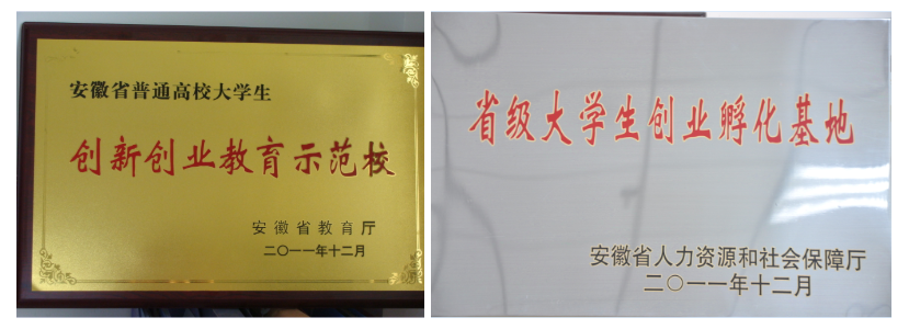 2011年学校就被安徽省教育厅评为“安徽省大学生创新创业教育示范校”,2012年大学生创业孵化基地被安徽省人社厅认定为“省级大学生创业孵化基地(AA级)”。经过多年的探索和实践,现已建构“普及、培训、竞赛、实践、扶持”大学生创新创业教育体系,为大学生双创实践提供服务的校内创新创业孵化基地达4000平米,可同时容纳孵育项目近40个;创新创业实践扶持政策正日益完善。