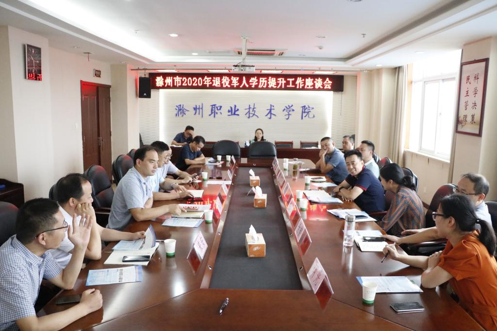 9月10日上午,金沙威尼斯官网在行政楼804会议室召开滁州市2020年退役军人学历提升工作座谈会。滁州市退役军人事务局及各县市区退役军人事务局负责人,校党委委员、校长助理、招生就业处处长穆松,继续教育学院院长李永泉等领导出席会议。会议由招生就业处副处长徐云龙主持。