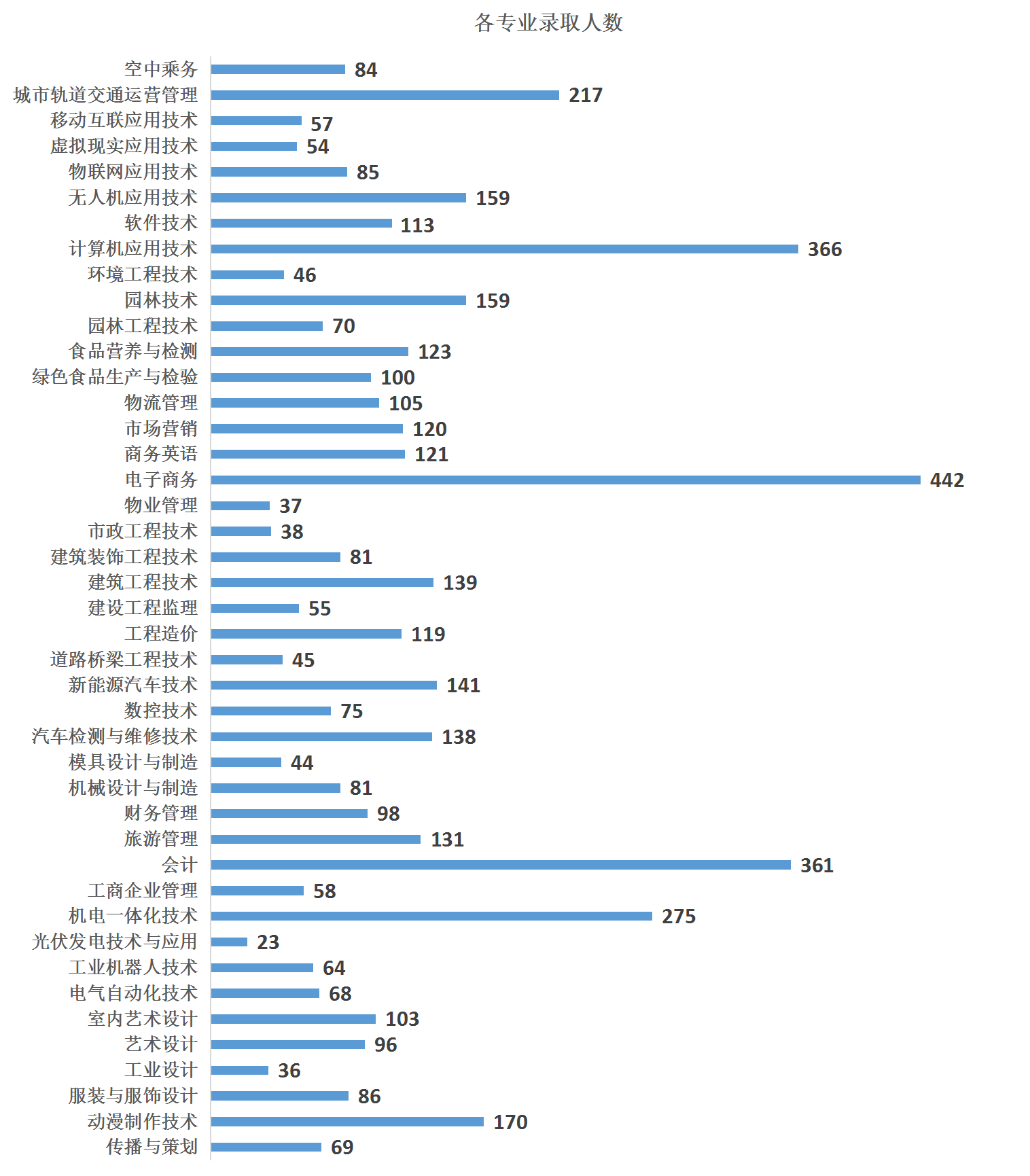 从专业分布来看,5052名新生分布在10个二级学院43个专业中,其中录取人数最多的4个专业分别是电子商务、计算机应用技术、会计、城市轨道交通运营管理、机电一体化技术等专业,每个专业都超过了300人。
