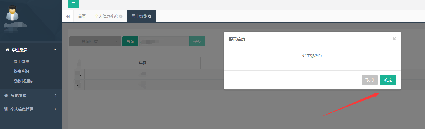 5.点击“学生缴费—网上缴费”,自动跳出应缴纳费用明细,可根据需要勾选需要缴费的项目,选中后点击提交并确定。如图1-7、图1-8: