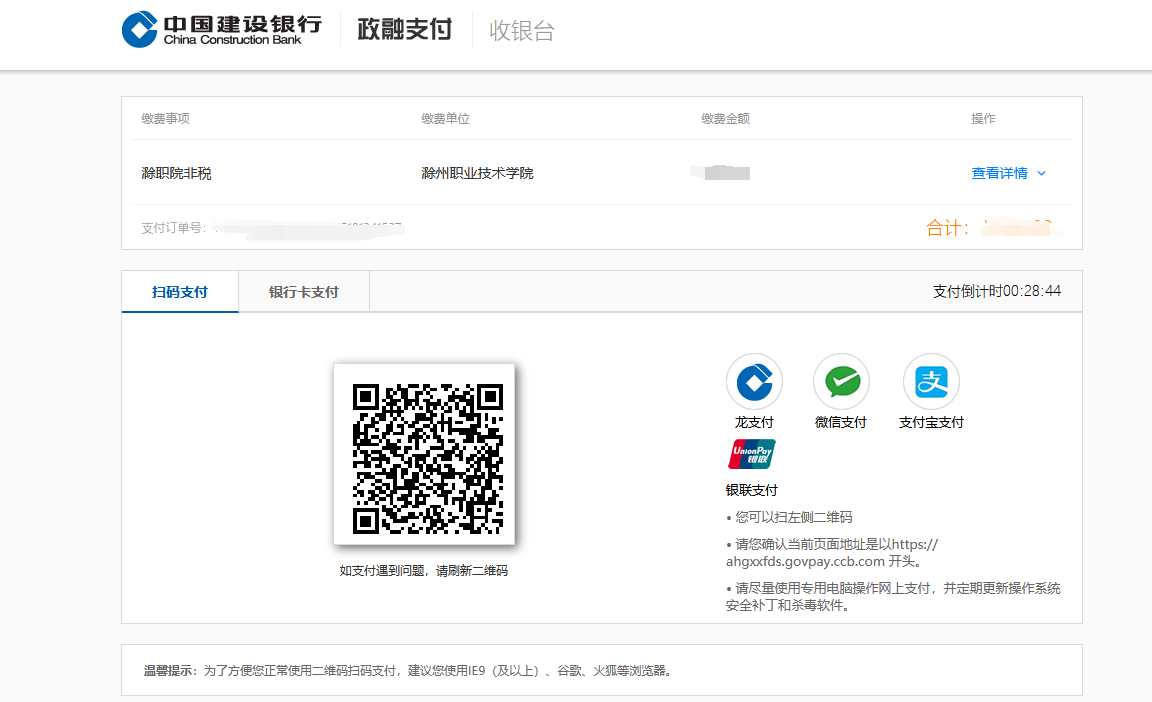 6.根据系统跳出的缴费方式,自主选择其中一种进行缴费(支持微信、支付宝及建行网银等多种方式)。如图1-9: