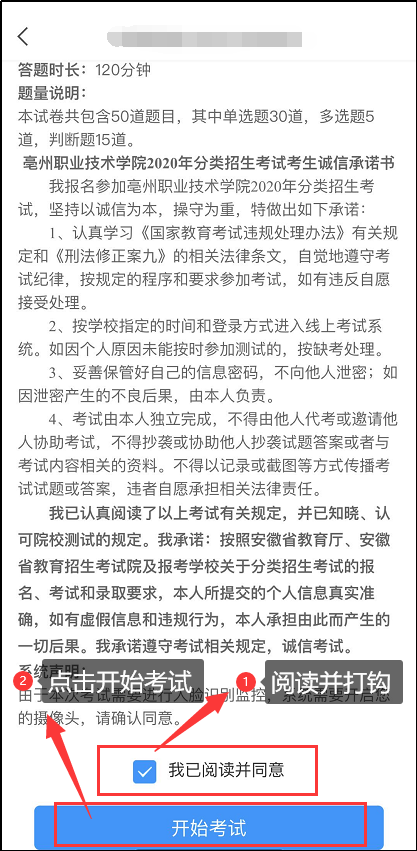 2.点击考试按钮,阅读并同意考生承诺后进行打钩,点击“开始考试”;