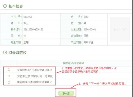 特别提醒:高职扩招录取确认只有在规定时间内(10月11日-12日),在规定网站(gkbm.ahzsks.cn)上操作方为有效。请各位考生一定要妥善保管自己的考生号、身份证号等个人信息,切勿泄露给其他人,更不要委托他人代替自己确认。一旦确认了录取院校,是不能修改的!!!