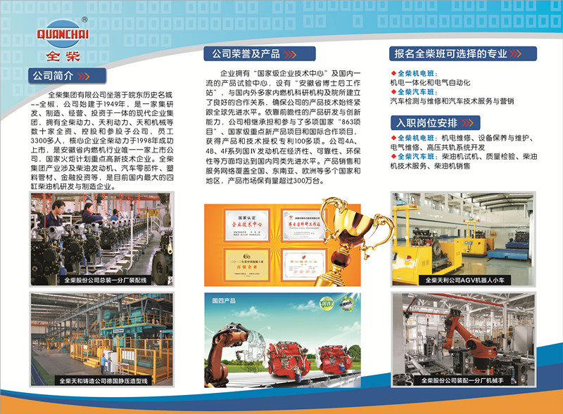2015年8月12日,学院与安徽全柴动力股份有限公司签署合作协议,定向培养高技能人才。双方合作开设“全柴机电班”和“全柴汽车班”两个订单班,现面向2015级新生招生,有意者从即日起即可报名,报名要求和待遇如下: