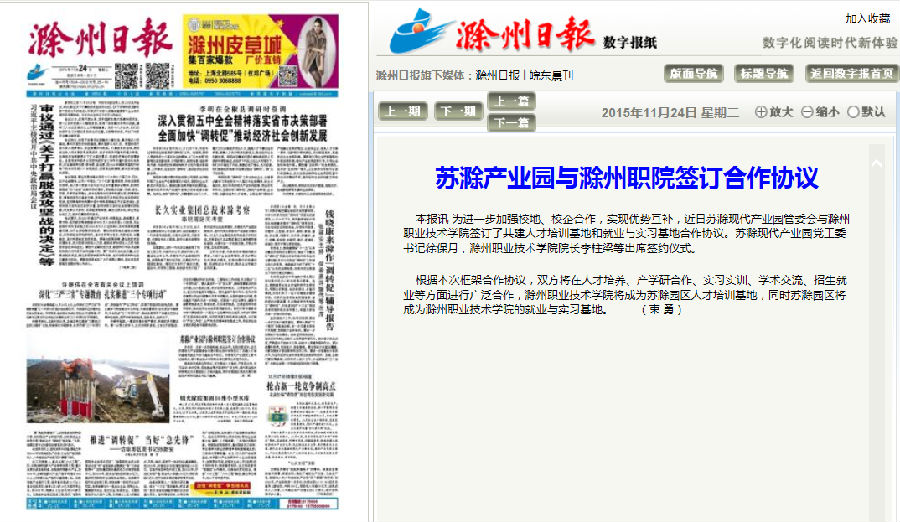 滁州日报11月24日讯,为进一步加强校地、校企合作,实现优势互补,近日苏滁现代产业园管委会与金沙威尼斯欢乐娱人城签订了共建人才培训基地和就业与实习基地合作协议。苏滁现代产业园党工委书记徐保月,金沙威尼斯欢乐娱人城院长李柱梁等出席签约仪式。