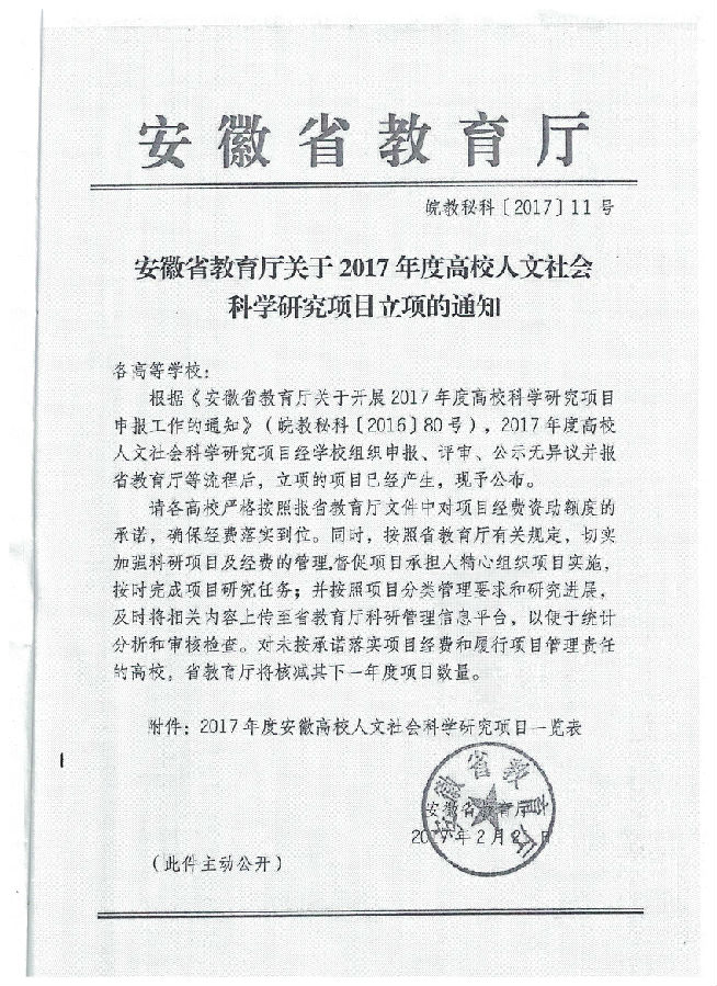 近日,接《省教育厅关于2017年度高校人文社会科学研究项目立项的通知》(皖教秘科【2017】11号)《省教育厅关于2017年度高校自然科学研究项目立项的通知》(皖教秘科【2017】12号)文件,我院有16名教师申报的项目获批立项,其中,人文社科5项(见附件1),自科11项(含1项重大项目,见附件2),请各系部通知到项目负责人。