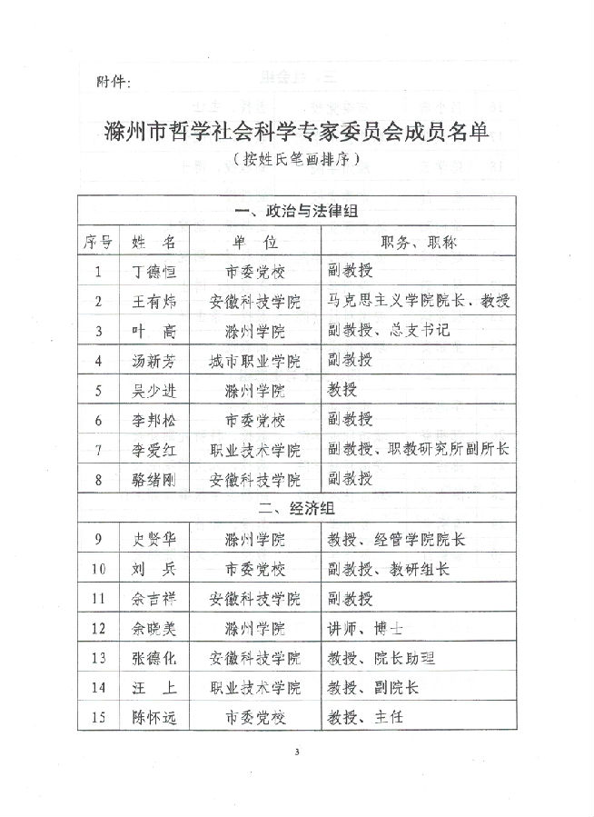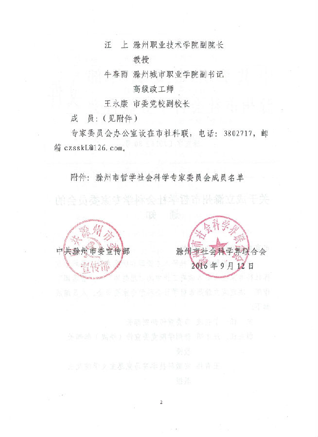 近日,接滁州市委宣传部《关于成立滁州市哲学社会科学专家委员会成员的通知》(滁宣字﹝2016﹞80号)文件,我院汪上、吴大明、李爱红、童宗安、陈光锐等5位同志进入滁州市哲学社会科学专家委员会成员,其中,汪上为委员会副主任委员,这是我院发挥人文社科人才资源力量更好地为地方经济社会服务的一个有力平台。