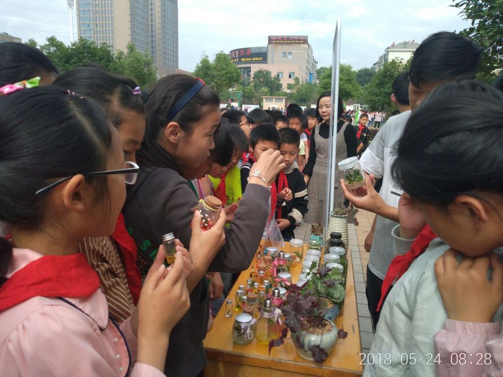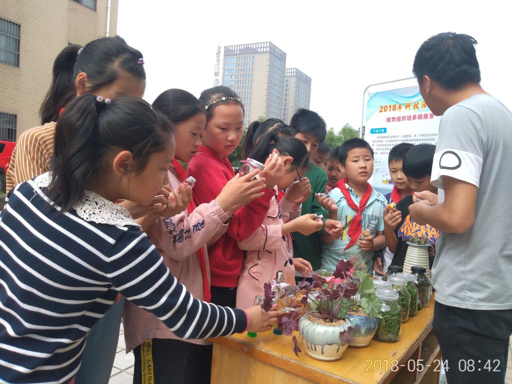 在完成科技活动周滁州市启动仪式的展览之后,科技团队按照计划走进校园展出,5月22至25日,该团队将微瓶景在我院行政楼大厅及学生宿舍区展出,向广大师生展示科技产品、普及科技知识,展出活动受到广大师生的一致好评。5月24日上午,该团队在姜自红老师与薛正帅老师的带领下走进龙蟠小学,面对科普展台,小学生们对微瓶景、植物组织培养表现出浓厚的兴趣。参观教师与学生面对好奇的同学,认真耐心讲解,履行着科普的责任。