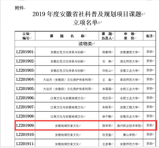 近日,根据安徽省社会科学界联合会下达的“2019年安徽省社科普及规划项目立项的通知”获悉,经公开申报、资格审查、专家评审、公示等环节,2019年安徽省社科普及规划项目共立项49项,其中读物类项目37项,工作研究(规划研究)类项目12项,金沙威尼斯官网陈学军教授主持的《安徽地域饮食文化》(LZ201909)项目立项建设,获资助经费1.5万元。